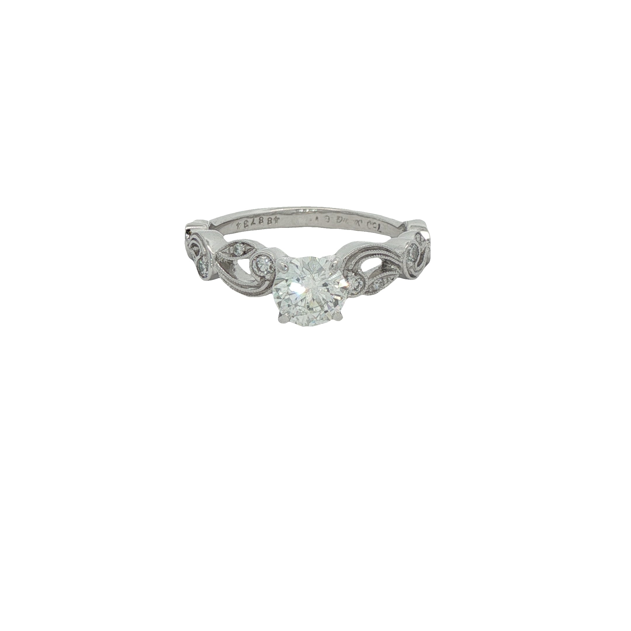 Ladies Preowned 18K White Gold Engagement Ring Scroll Design with Round Center Diamond having an approximate total weight of 0.60cttw Color J / Clarity SI2