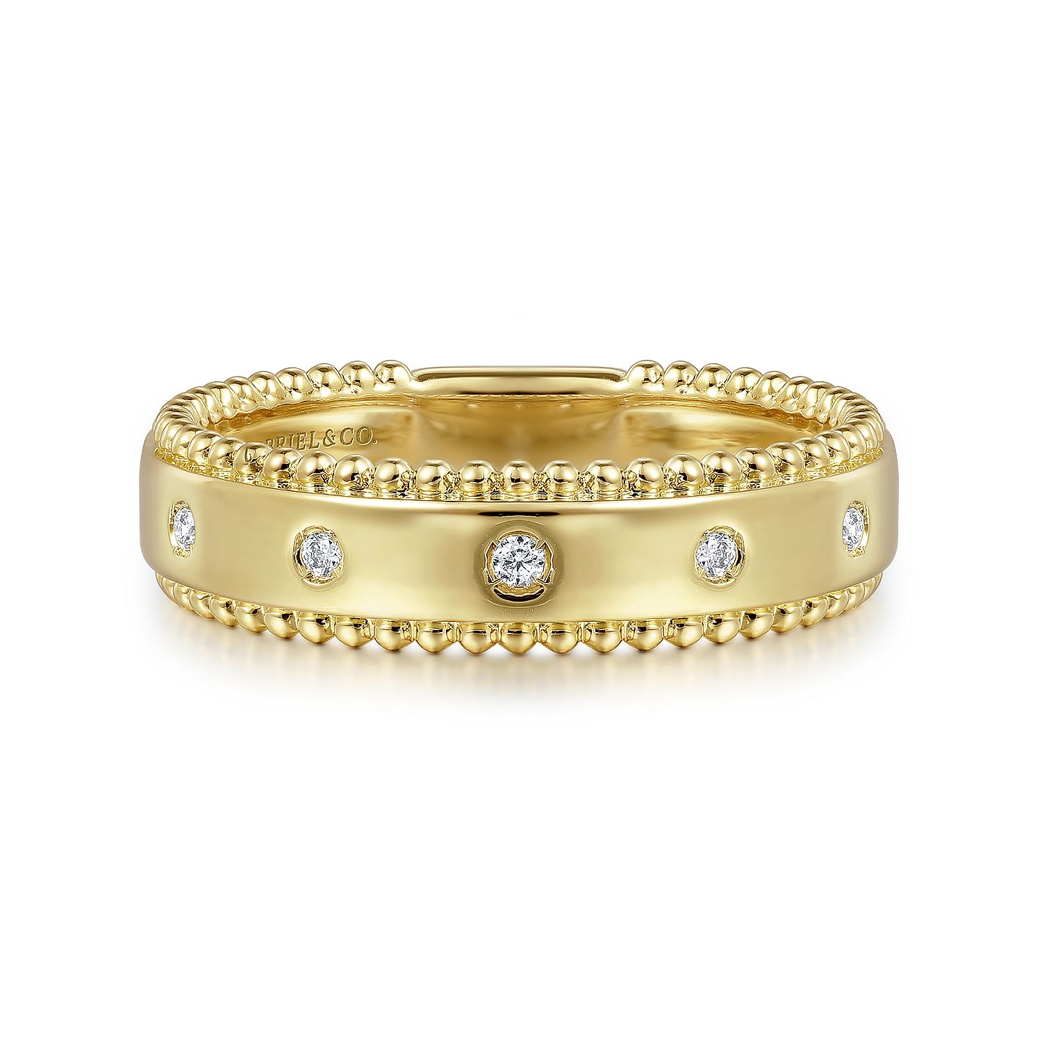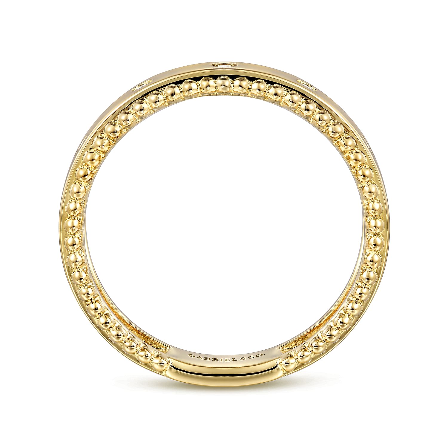 Ladies 14K Yellow Gold Diamond Bezel Ring Bujukan stackable collection containing Five (5) small Round Diamonds having an approximate total weight of .04ct Color G/H Clarity SI2