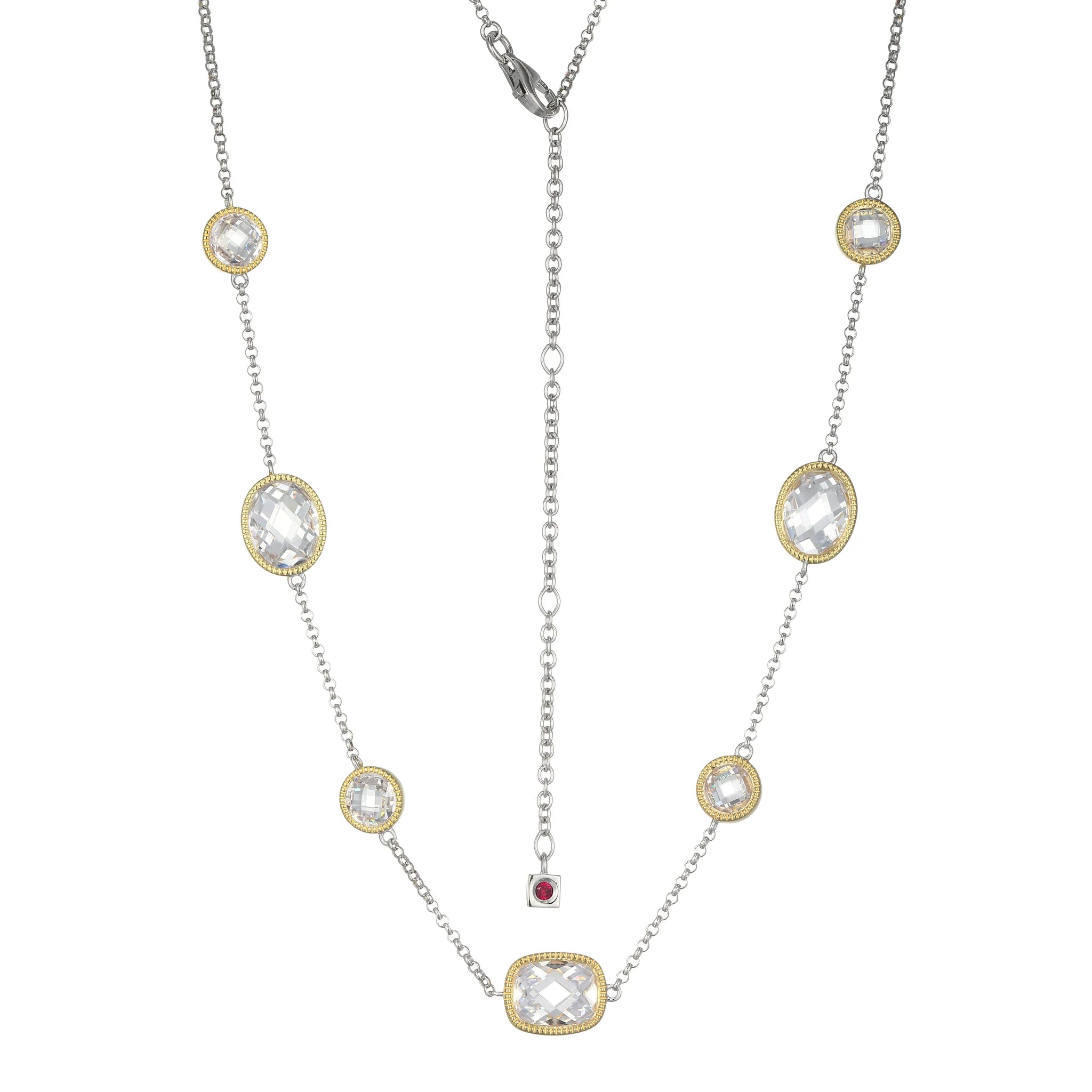 Ladies Sterling Silver Necklace with Yellow Gold Plated Milgrain Framed Various Shape Cubic Zirconias