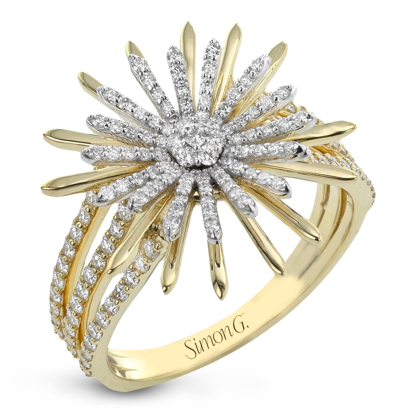 Ladies Jewelry by Simon G 18K Yellow and White Gold Ring Starburst containing ninety one (91) round diamonds having an approximate total weight of 0.40cttw Color G-H / Clarity VS-SI