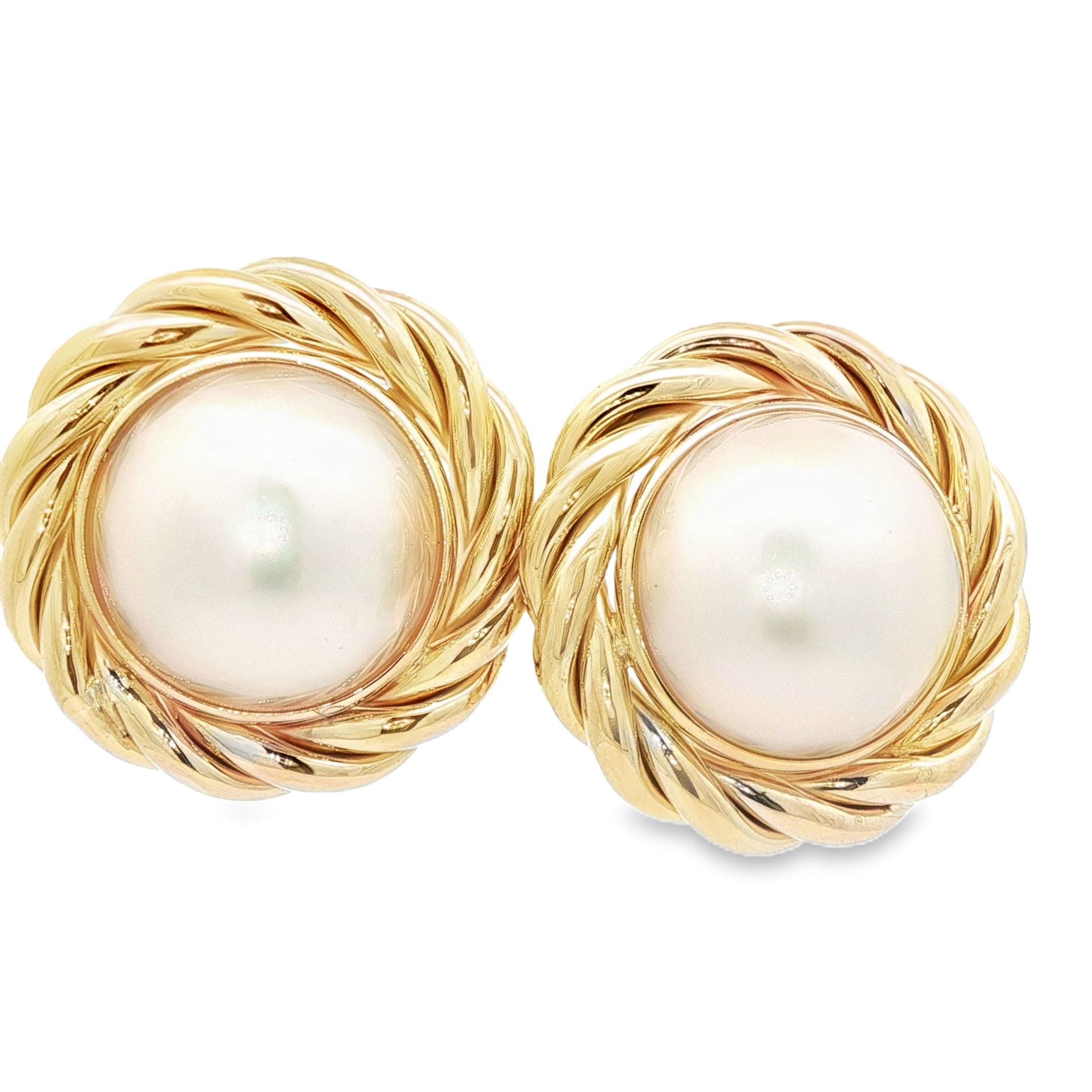 Ladies Preowned 14K Yellow Gold Earrings Large Mobi Pearls with Yellow Gold Frame