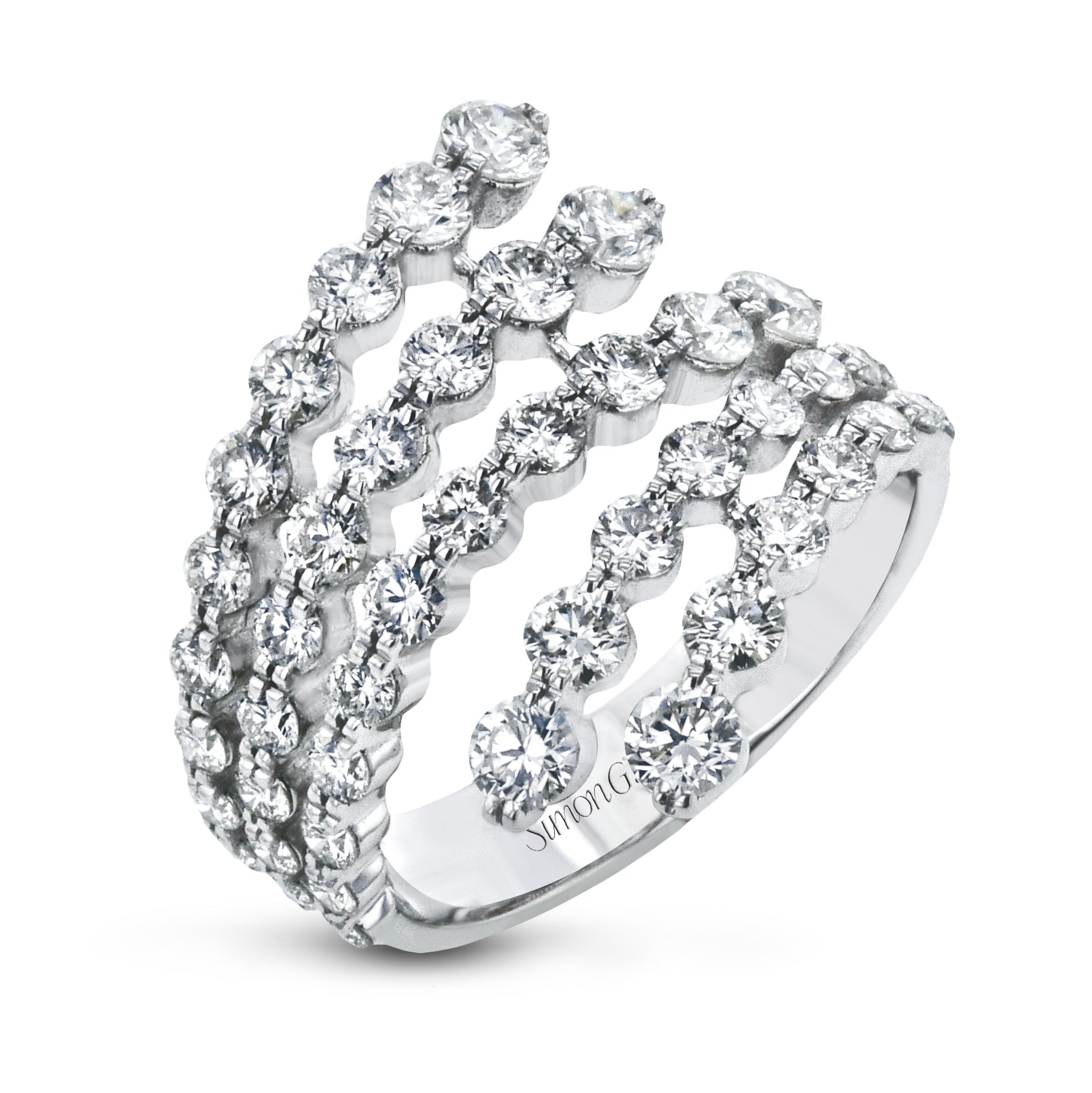 Ladies Jewelry by Simon G 18K White Gold Ring Overlapping containing forty six (46) round diamonds having an approximate total weight of 2.18cttw Color G-H / Clarity VS-SI