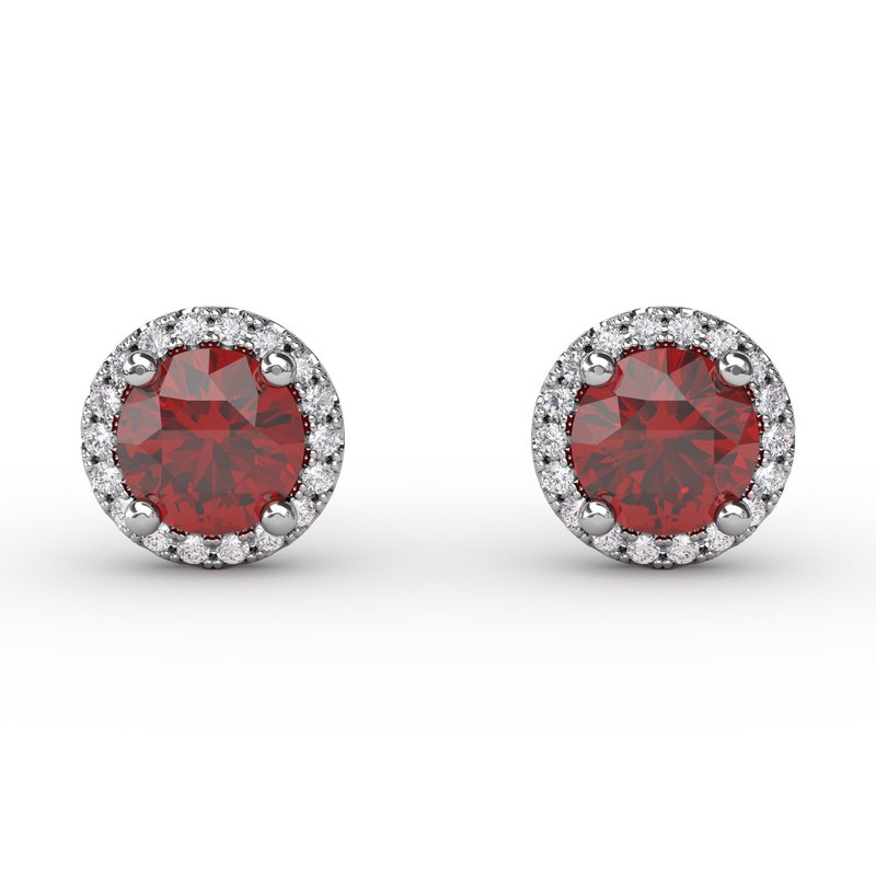 Ladies 14K White Gold Earrings Halo containing two (2) round rubies having an approximate total weight of 1.36cttw and thirty six (36) round diamonds having an approximate total weight of 0.14cttw Color G-H / Clarity SI1-VS2
