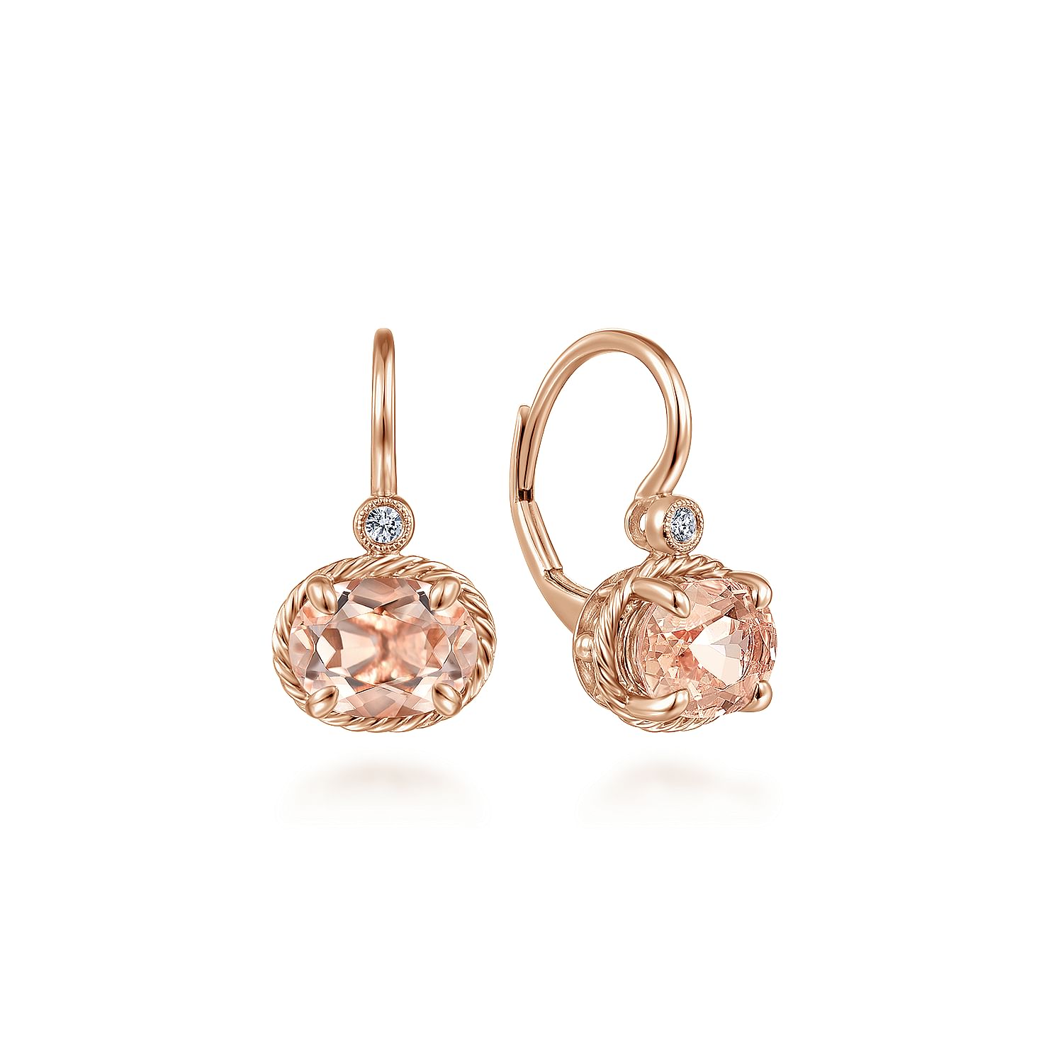 Ladies 14K Rose Gold Earrings Leverback containing two (2) Oval Morganites having an approximate total weight of 2.33cttw and two (2) round diamonds having an approximate total weight of 0.03cttw Color J / Clarity I1