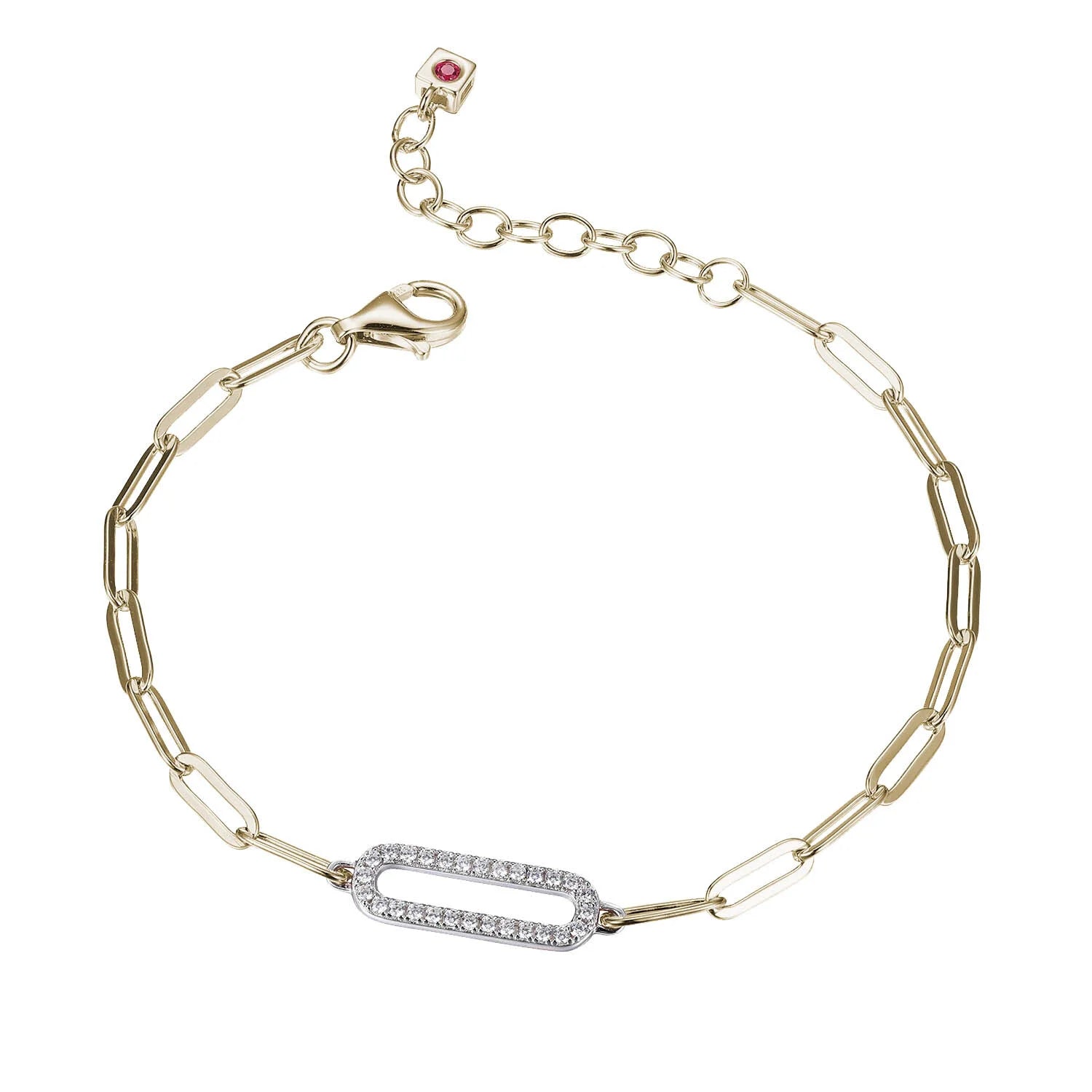 Ladies Sterling Silver and Yellow Gold Plated Bracelet Oblong Cable rectangle with Cubic Zirconia 6.5" with extension