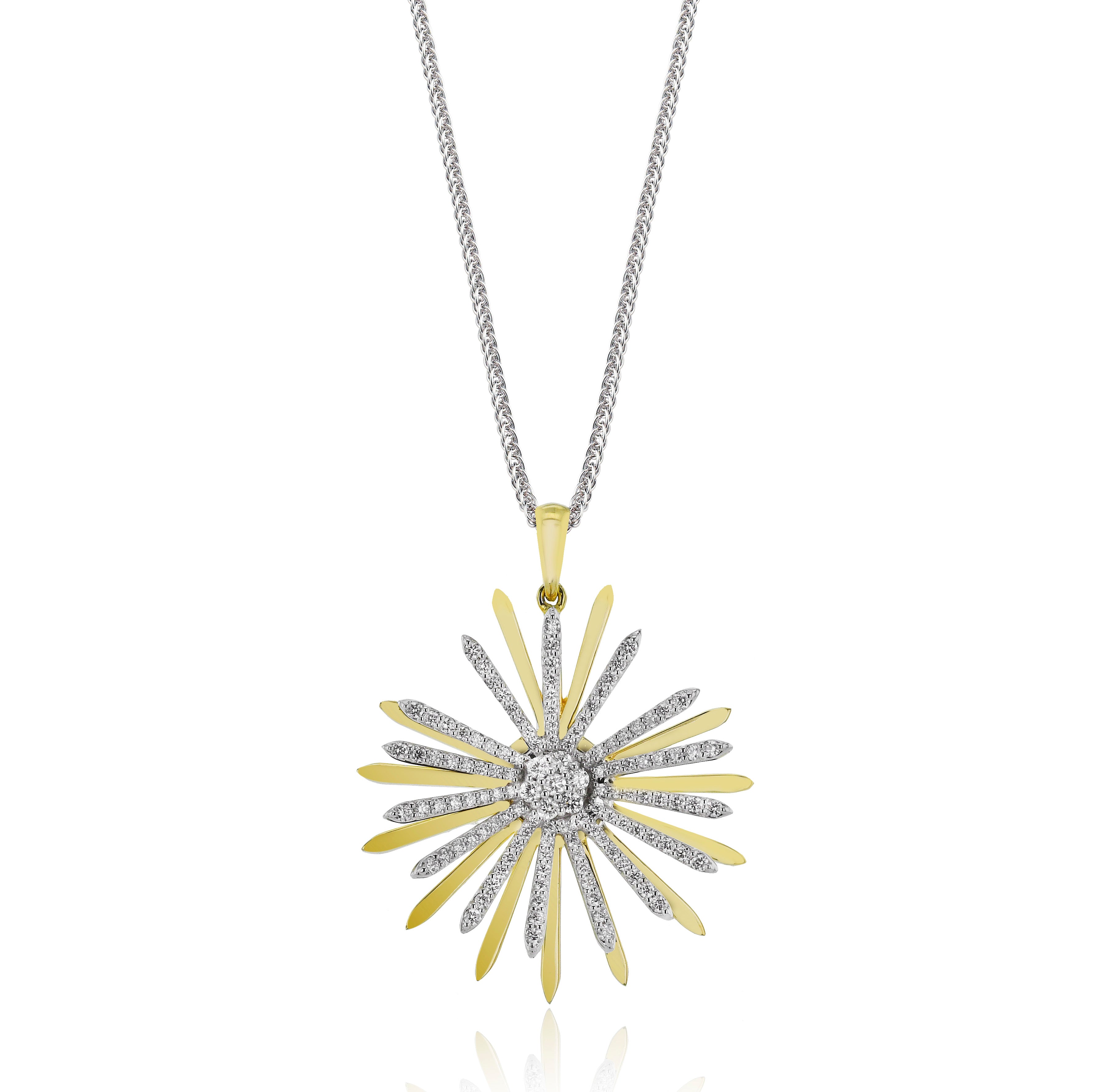 Ladies Jewelry by Simon G 18K Yellow and White Gold Pendant Starburst containing one hundred twenty seven (127) round diamonds having an approximate total weight of 0.56cttw Color G-H / Clarity VS-SI