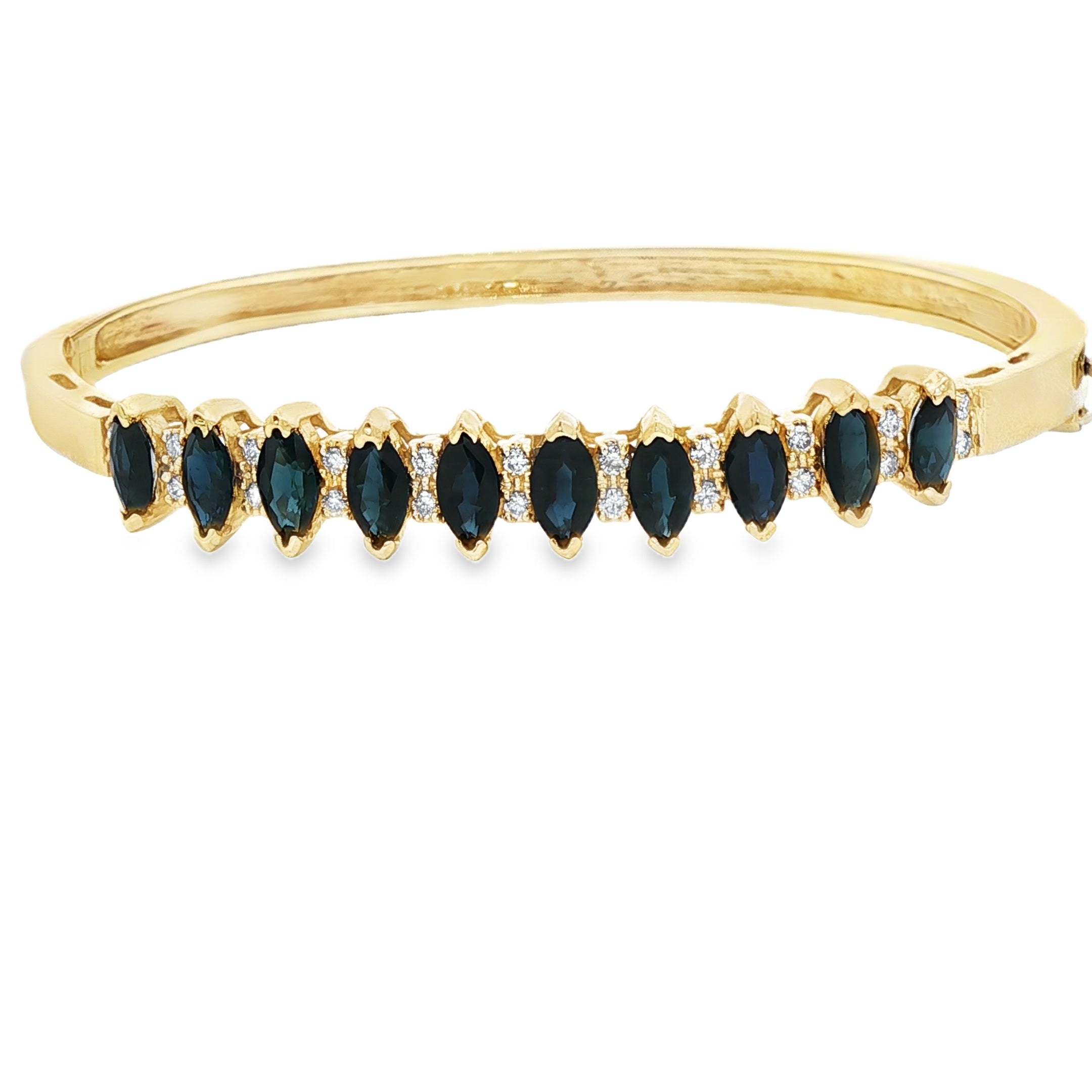 Ladies Preowned 14K Yellow Gold Bangle Bracelet containing twenty two (22) round diamonds and ten (10) Oval Blue Sapphires