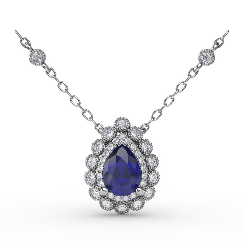 Ladies 14K White Gold Pendant Pear Halo containing one (1) Pear Sapphire having an approx total weight of 0.75ct and thirty three (33) round diamonds having an approximate total weight of 0.28cttw Color G-H / Clarity SI1-VS2
