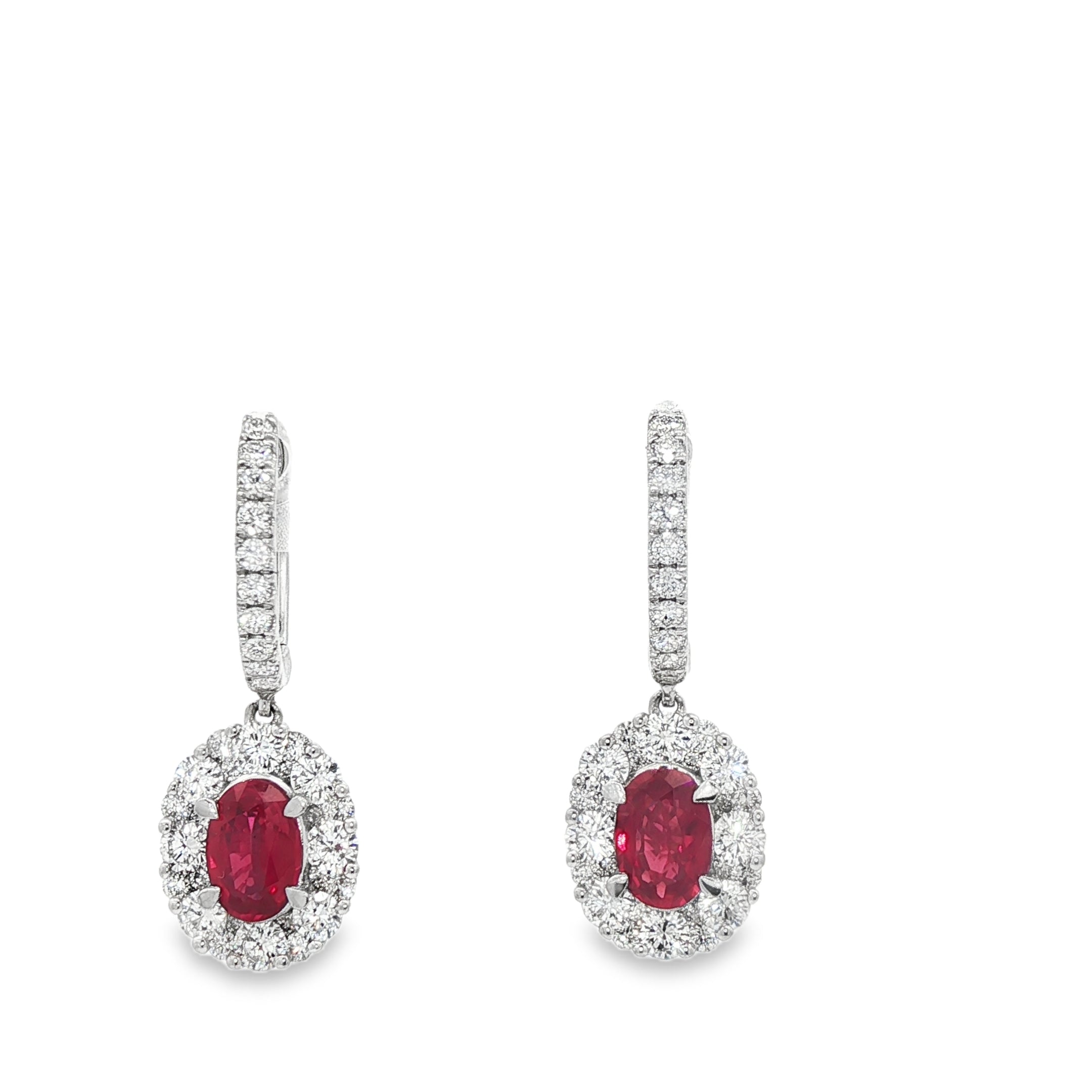 Ladies Preowned 18K White Gold Earrings containing two (2) Oval Burmese Rubies and sixty eight (68) round diamonds having an approximate total weight of 1.00cttw Color E-F / Clarity VVS