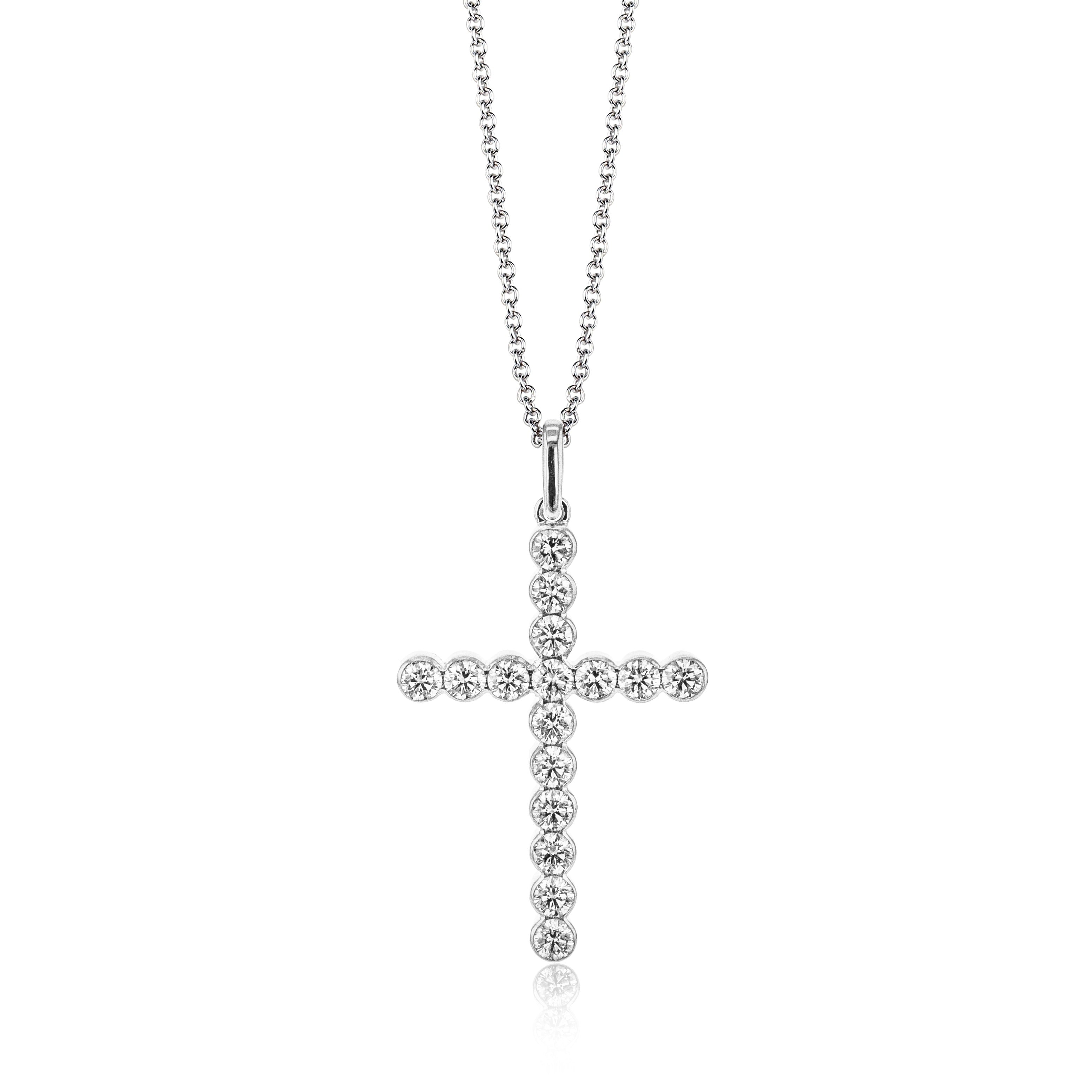 Ladies Jewelry by Simon G 18K White Gold Pendant Cross 1/2 Bezel Set sixteen (16) round diamonds having an approximate total weight of 1.10cttw Color G-H / Clarity VS-SI